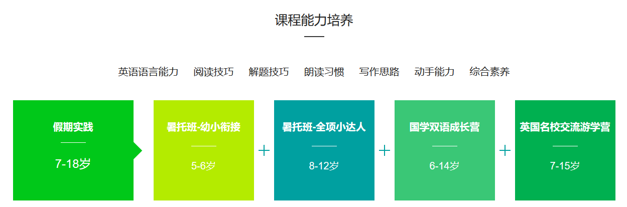 课程目标8-12岁训练解题技巧,拓宽知识面,提升综合素养,为小初衔接打下扎实基础,成为名校所需的优质型学生!课程设置每天7小时,20天 课程特色全日制教学,高效有趣课堂,培养良好的
