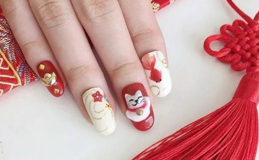 红色的招财猫和红色的圣诞老人,在指甲上是不是显得超级可爱,很有节日的气氛。新年和闺蜜自拍比V,如此软萌的美甲亮出来一定是非常吸引眼球的,卡通人物还可以选择kitty猫,旺仔,熊本熊等卡哇伊的公仔。
