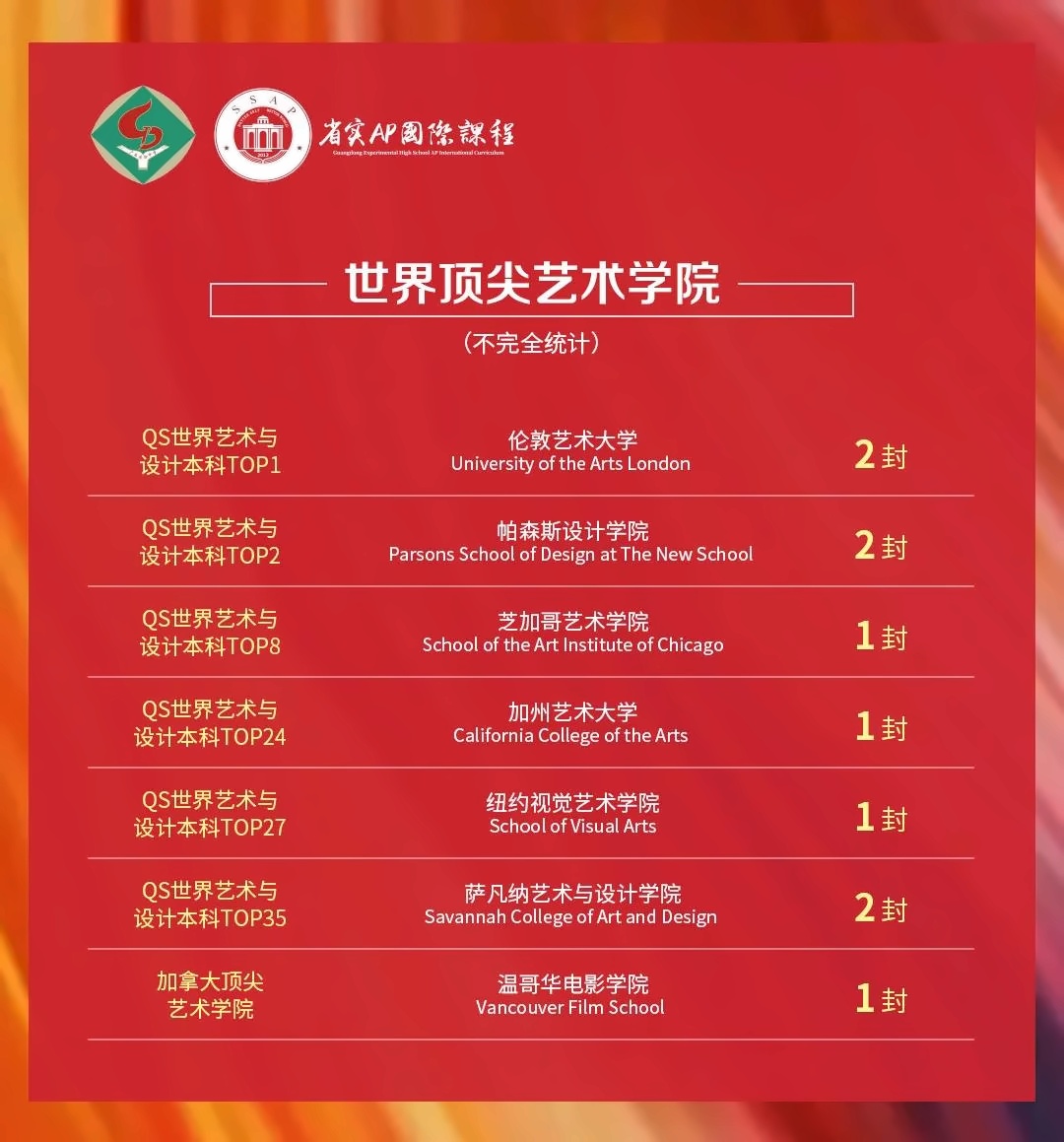 今年,省实AP在世界艺术学院持续发力,共 斩获9所世界艺术学院12封offer ,其中不乏QS世界大学艺术与设计本科、TOP2的伦敦艺术大学与帕森斯设计学院。